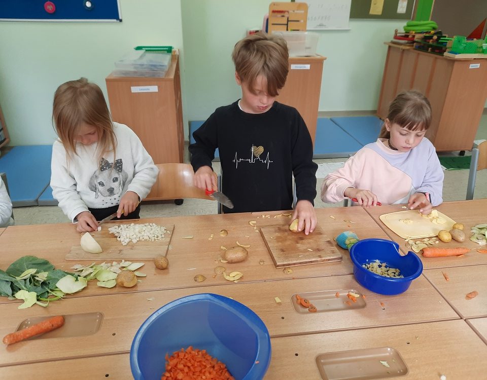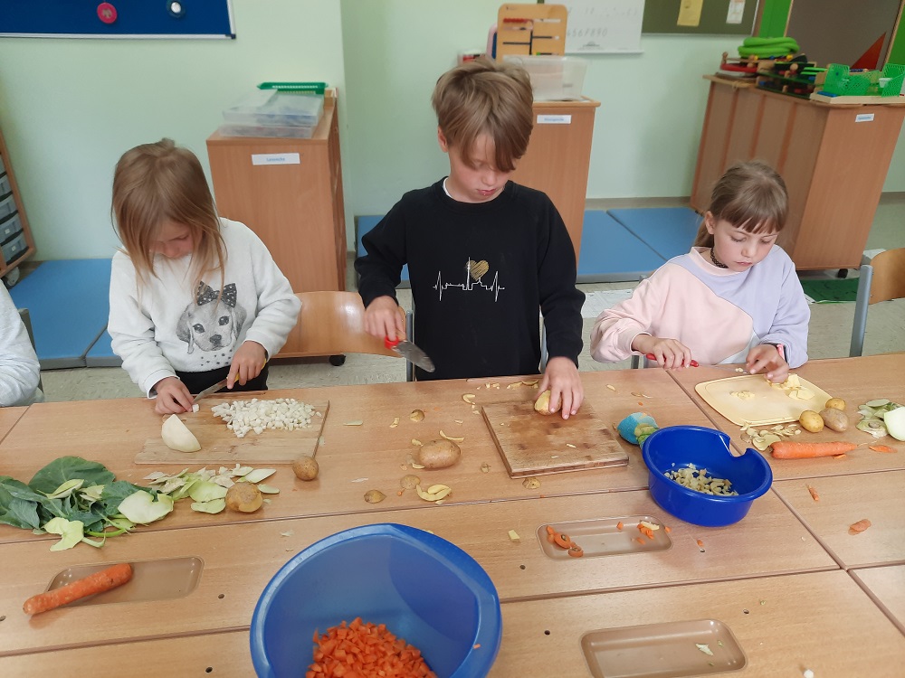 Die Schüler kochen Gemüsesuppe